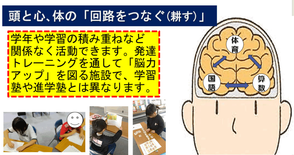 ひろま~れの「特徴的な活動②」を紹介いたします。ひろま~れでは、子どもたちの脳(前頭前野)の発達を促すために「脳力アップトレーニング」も取り入れています。学童期には脳の中でも最も大切な部位と言われている「前頭前野」が急激に発達する大切な時期であるので、この時期を「黄金期」と呼ぶ学者もいます。学童期に脳(前頭前野)を健全に発達させる事はとっても大切な事なのです。