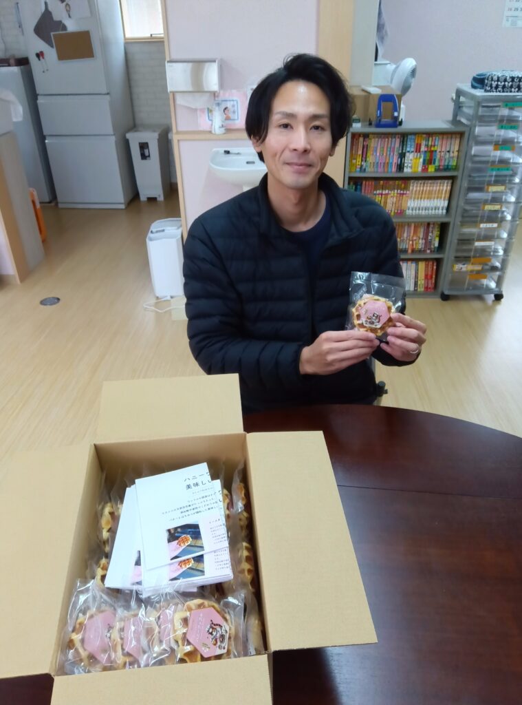 先日、洋野町で養蜂を営む中曽根さんが来所し、中曽根さんが生産したはちみつがたっぷり入ったワッフルをたくさんいただきました。中曽根さんは、完熟したはちみつの採蜜を早朝に行うことにより、日中に集められた純度の低い蜜が混入しないようにして、不純物だけを取り除いた限りなく純度や糖度を高めた非加熱の天然はちみつを、こだわりを持って生産している方です。
