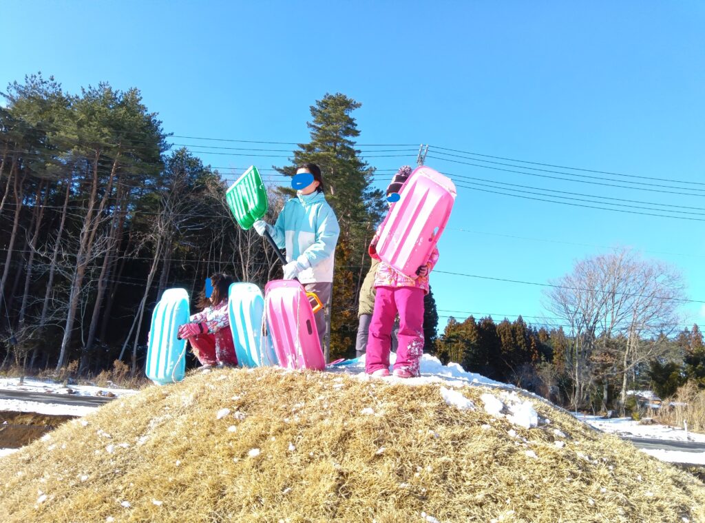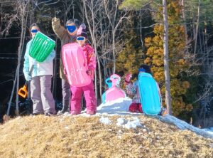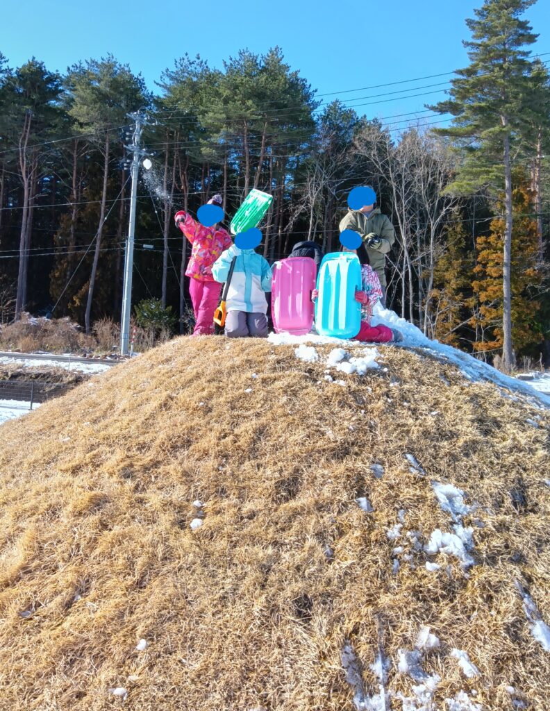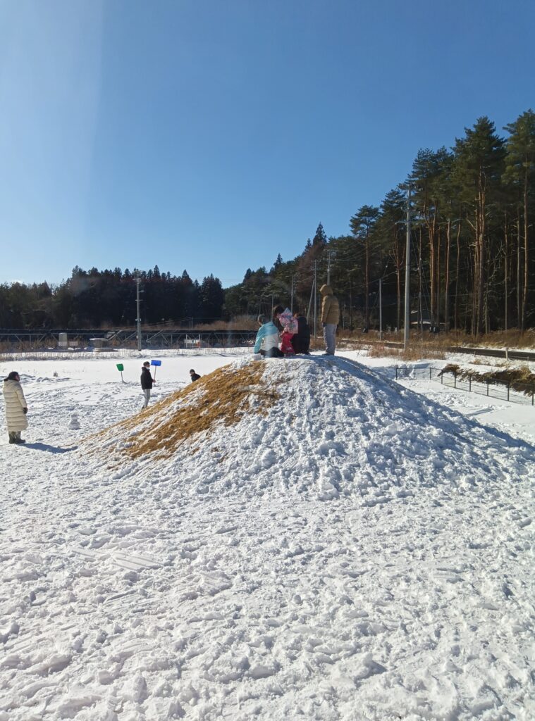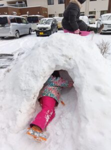 最近の子どもはよく「外で遊ばなくなった」、「複数の友達と遊ばなくなった」、「室内でゲームばかりやっている」などとよく言われます。でも、それは、ひろま~れの子どもたちには当てはまりません。ひろま~れでは今、男女対抗雪合戦がブームのようです。女子チームは体力で敵わない男子チームに対抗するため、標高2メートルの「まんじゅう山」に陣地を築き、男子の雪玉を防いでいました。雪合戦が好きなのは、昭和の子どもも令和の子どもも一緒ですね。