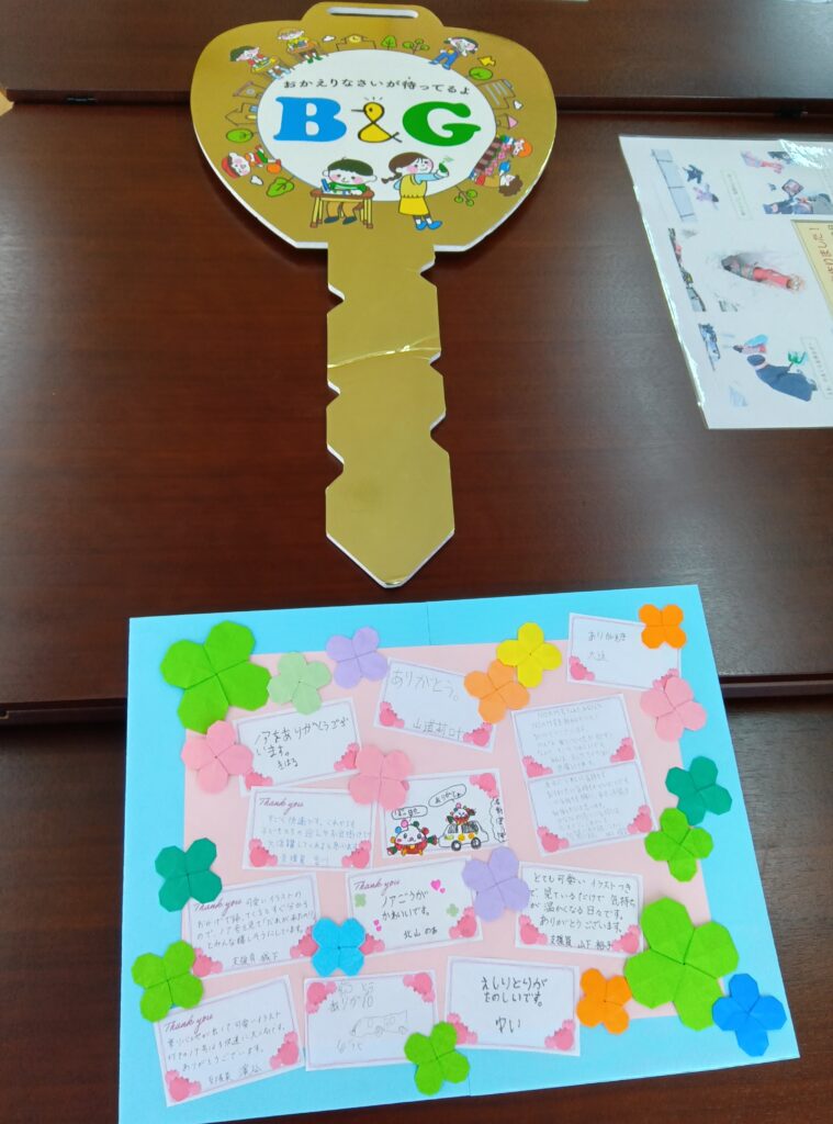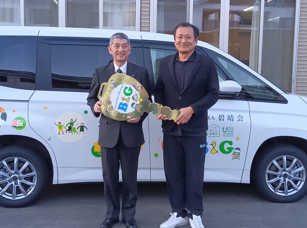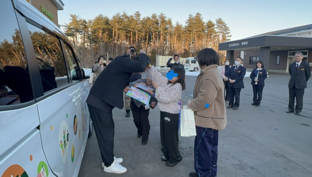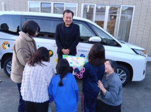 2月2日(月)に、B&G財団の菅原理事長さん、洋野町の岡本町長さんらのご臨席をいただき、送迎車両のお披露目会が行われました。子どもたちは、大好きなノア号を送ってくれた菅原理事長さんに、感謝の気持ちがこもった感謝状と手作り金メダルを送りました。