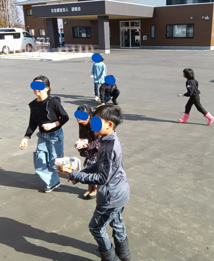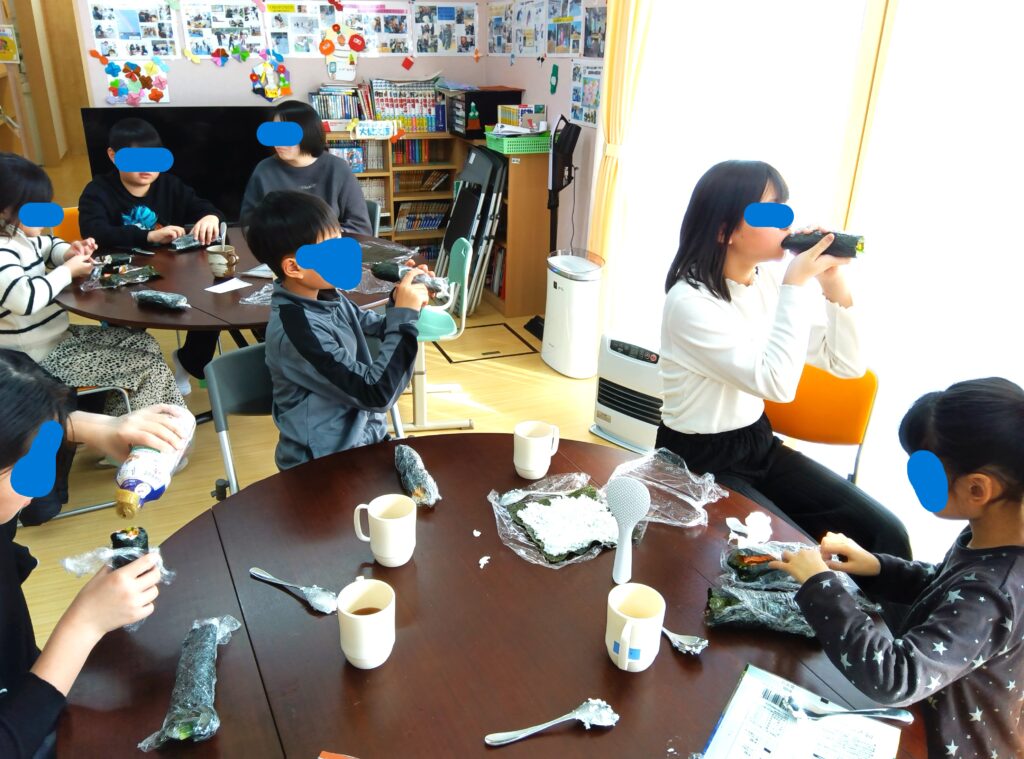 ひろま~れでは、一足遅れとはなりましたが、7日に豆まきと恵方巻作りを行いました。自分たちで好きな具を入れ、世界に1つだけの大きな恵方巻が出来上がりました。いつもはペチャクチャおしゃべりをしながら食事をする子どもたちですが、たくさんの福が舞い込んでほしいのでしょうか、今日はなんと無言!恵方巻の後は豆まきです。たくさんの鬼を追い出し、たくさんの福を招き入れたひろま~れでした。